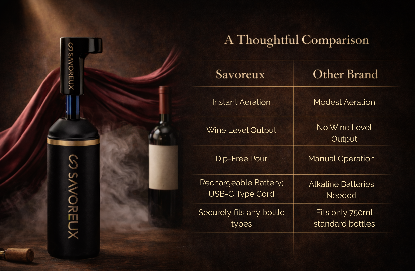 Thoughtfully designed and fully rechargeable, the Savoreux Smart Aerator brings precision to every pour
